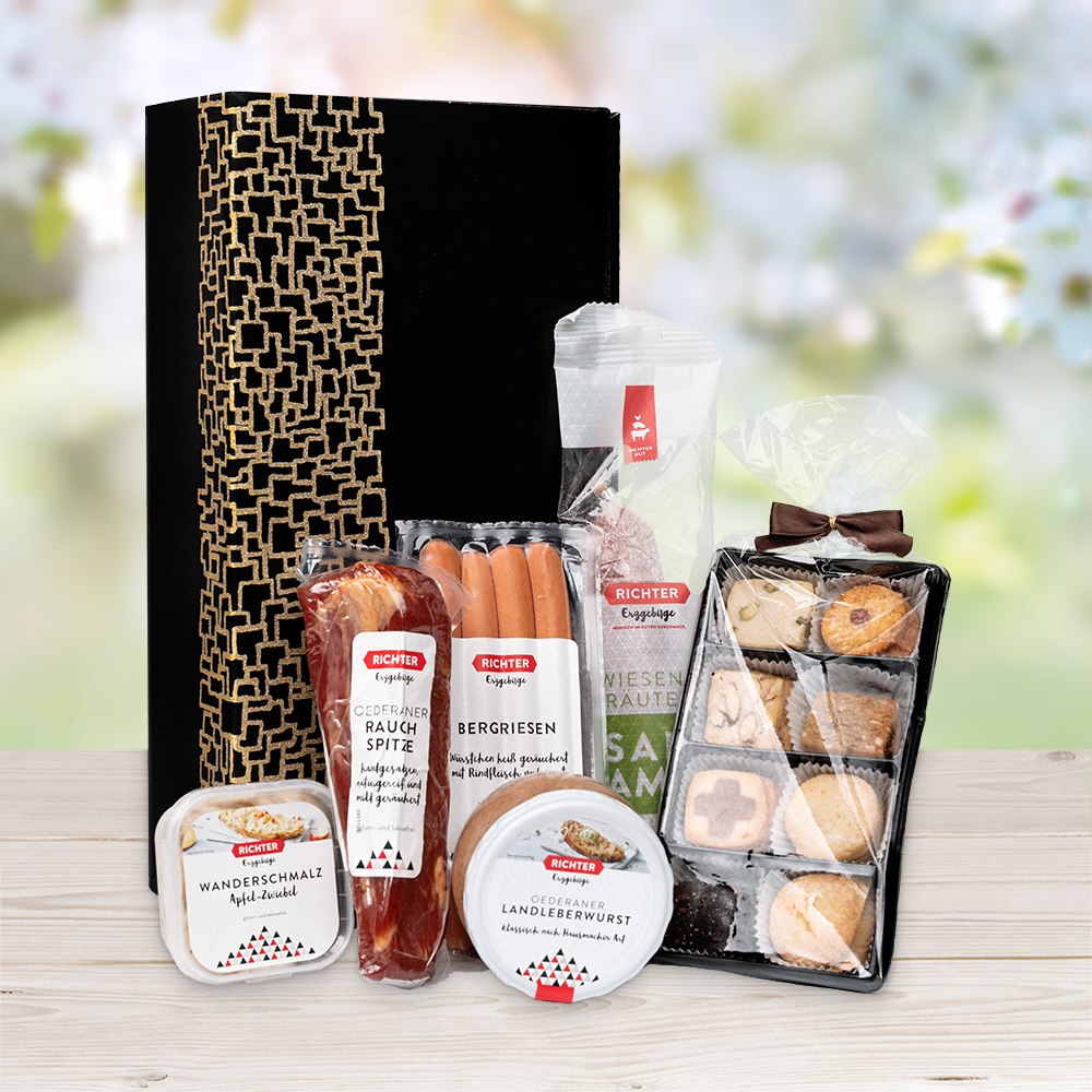 Ein edle Aufmerksamkeit. Das "kleine Schwarze" mit Geschmack. Diese Präsentkartonage in elegantem Schwarz mit Glitzerlack in Gold ist gefüllt mit: