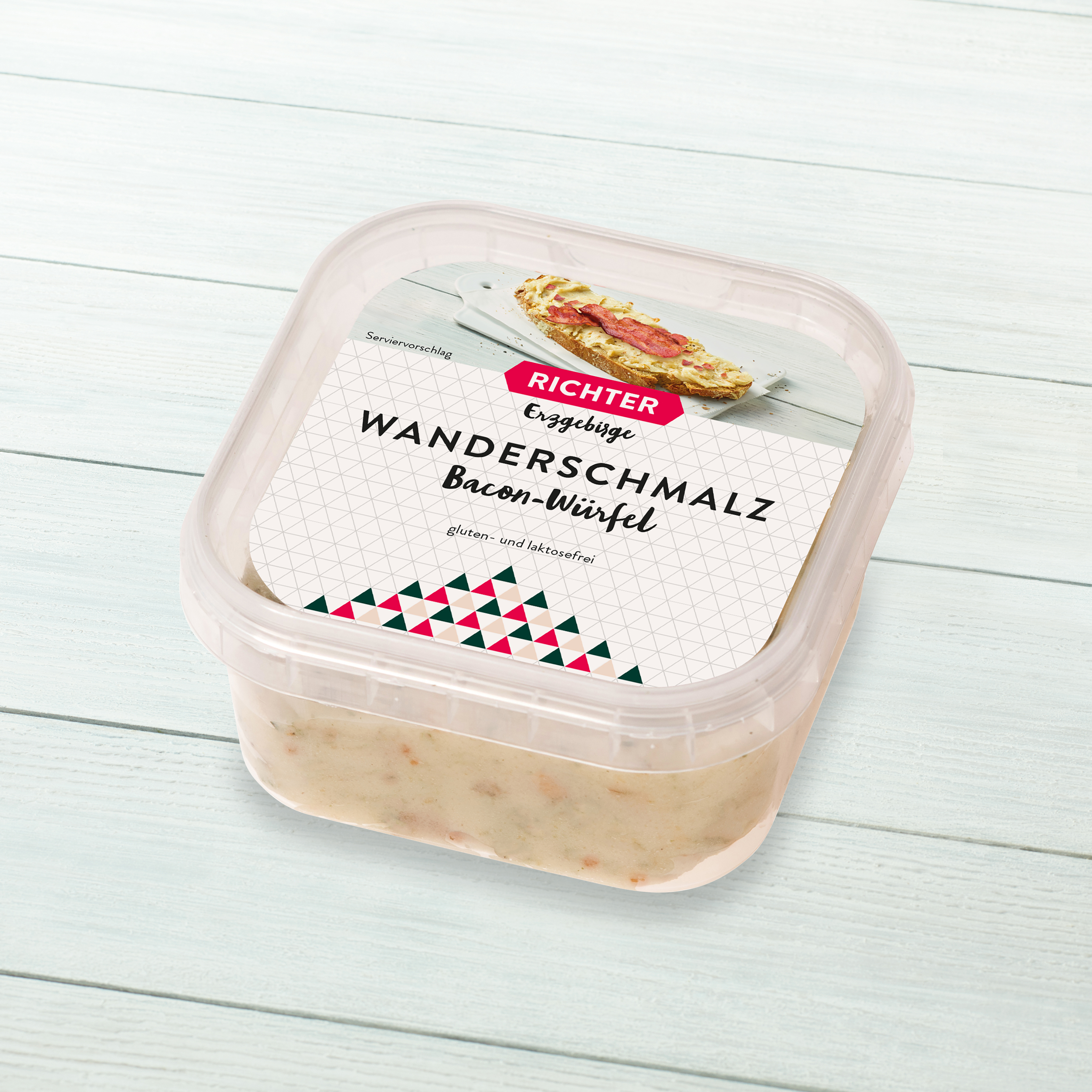Feines Schmalz mit gerösteten Schinkenwürfeln. Dies ist im Erzgebirge ein perfekter Begleiter auf gutem Brot. Kräftige Speckfettbemmen kennt man schon aus dem Bergbau. Die Variante mit deftigem Bacon von Richter Erzgebirge ist eine neue Variante unter den Wanderschmalz-Sorten. Verfeinern Sie Ihr Schmalzbrot noch mit krossen Röstzwiebeln.