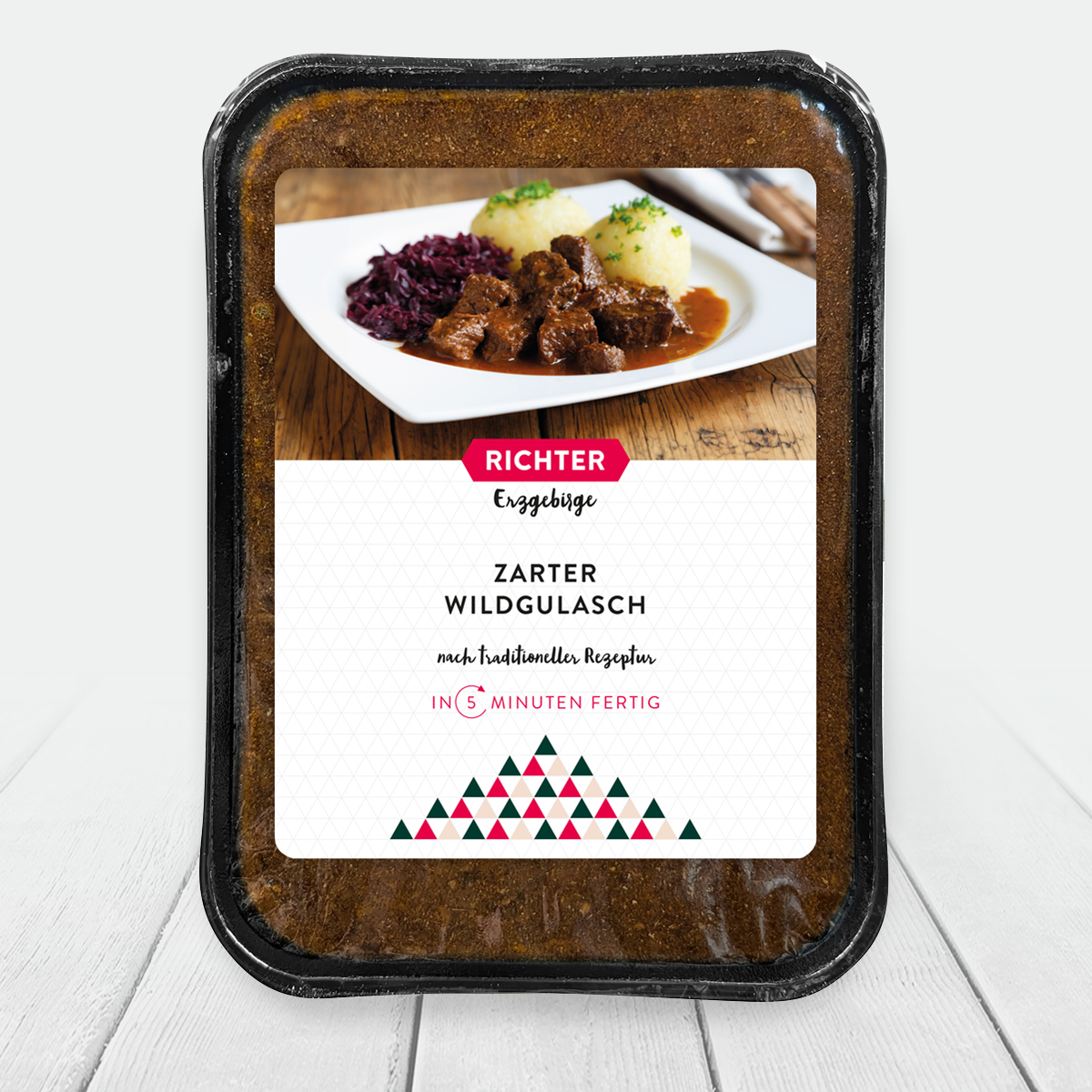 Dieser Wildgulasch wird auch heute noch liebevoll in unserem Haus selbst gekocht. Besonderes Augenmerk liegt auf der Auswahl der köstlichen Fleischstücke für eine perfekte Qualität. Mit Zwiebeln, kräftigem Tomatenmark, Preiselbeeren und einem Schuß Rotwein verfeinert.