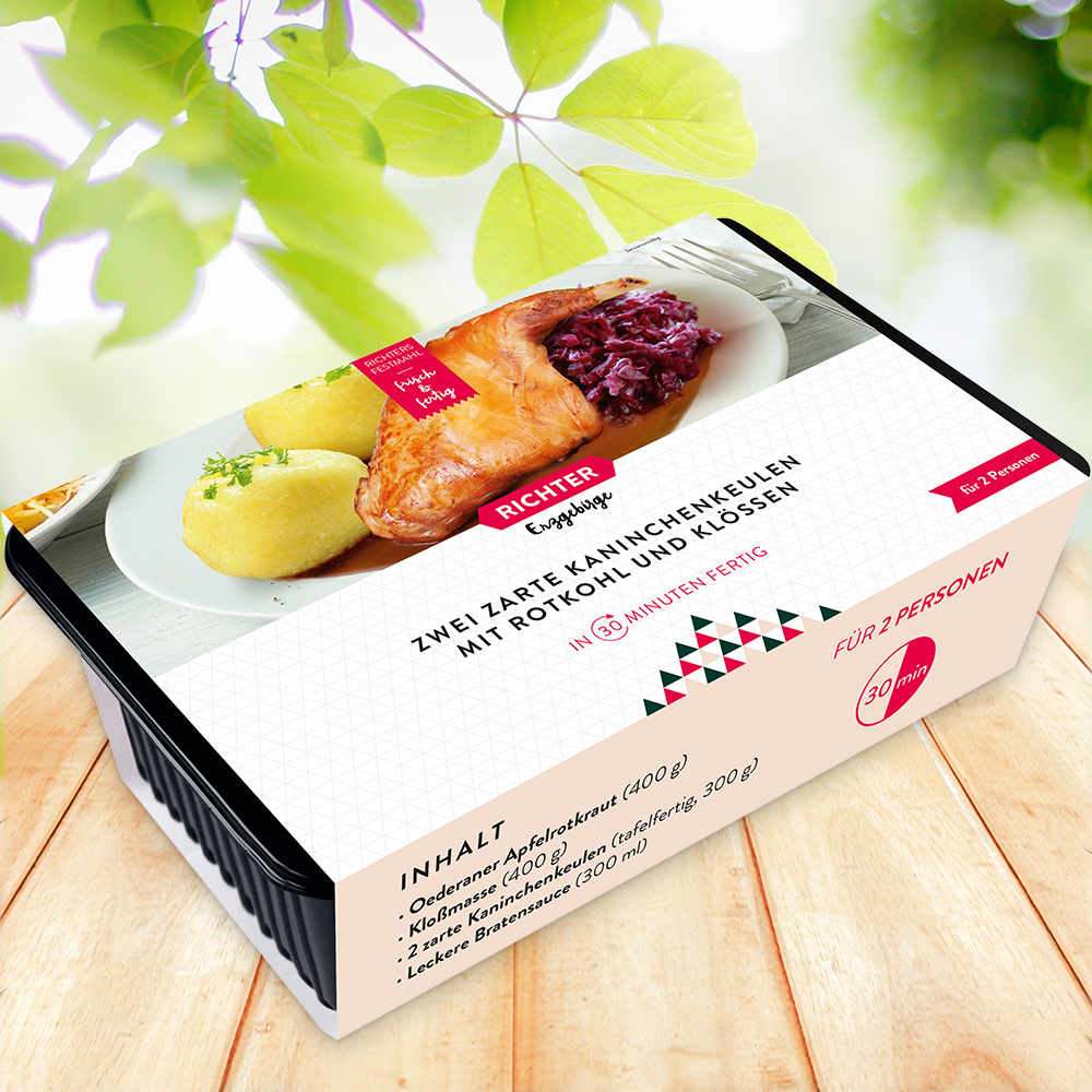 Es erwartet Sie ein küchenfertiges Gourmetmenü in beste Qualität: Unsere Kaninchenkeulen, sorgfältig ausgewählt und mit wenig Fettanteil, bereiten wir schonend im Sous-vide-Verfahren zu, womit wir stets ein saftig-zartes Kaninchenfleisch garantieren können. Dazu gibt es traditionelle Kartoffelklöße und unser fein würziges Apfelrotkraut – ein wahres Geschmackserlebnis für die Feiertage, das ohne viel Aufwand schnell fertig auf dem Tisch steht.